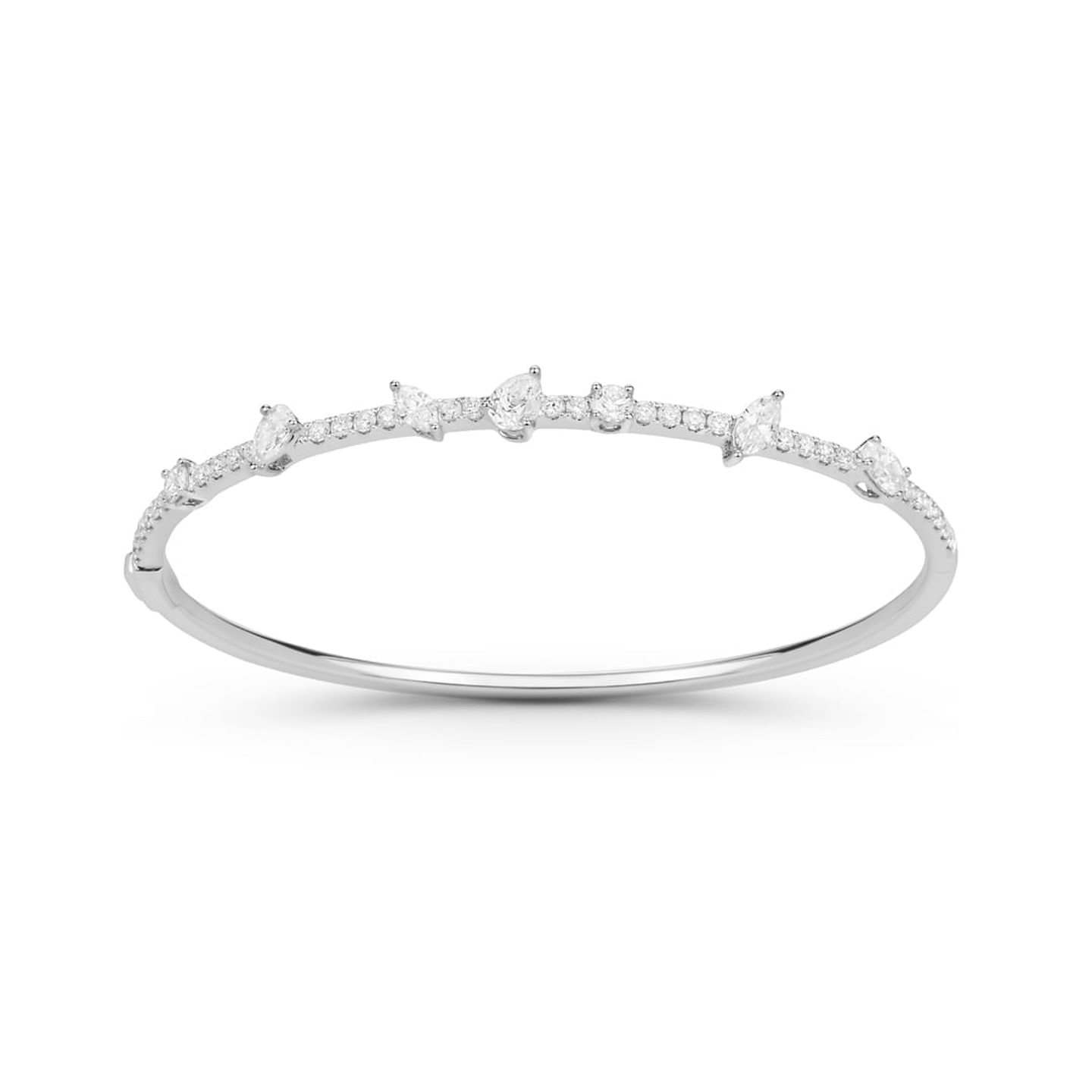 Esta refinada pulseira rígida em ouro branco 18 quilates é uma peça que exala elegância e sofisticação. Com um peso de 9,78 gramas, a pulseira é adornada com 34 diamantes brilhantes que totalizam 0,88 quilate, além de uma pedra em lapidação oval de 0,26 quilate, duas pedras em lapidação navete que somam 0,30 quilate e uma pedra em lapidação gota de 0,48 quilate. Essa combinação de diferentes lapidações cria um visual luxuoso e marcante, tornando-a ideal para complementar looks tanto formais quanto casuais.